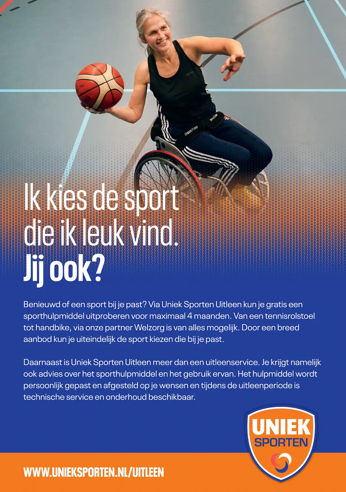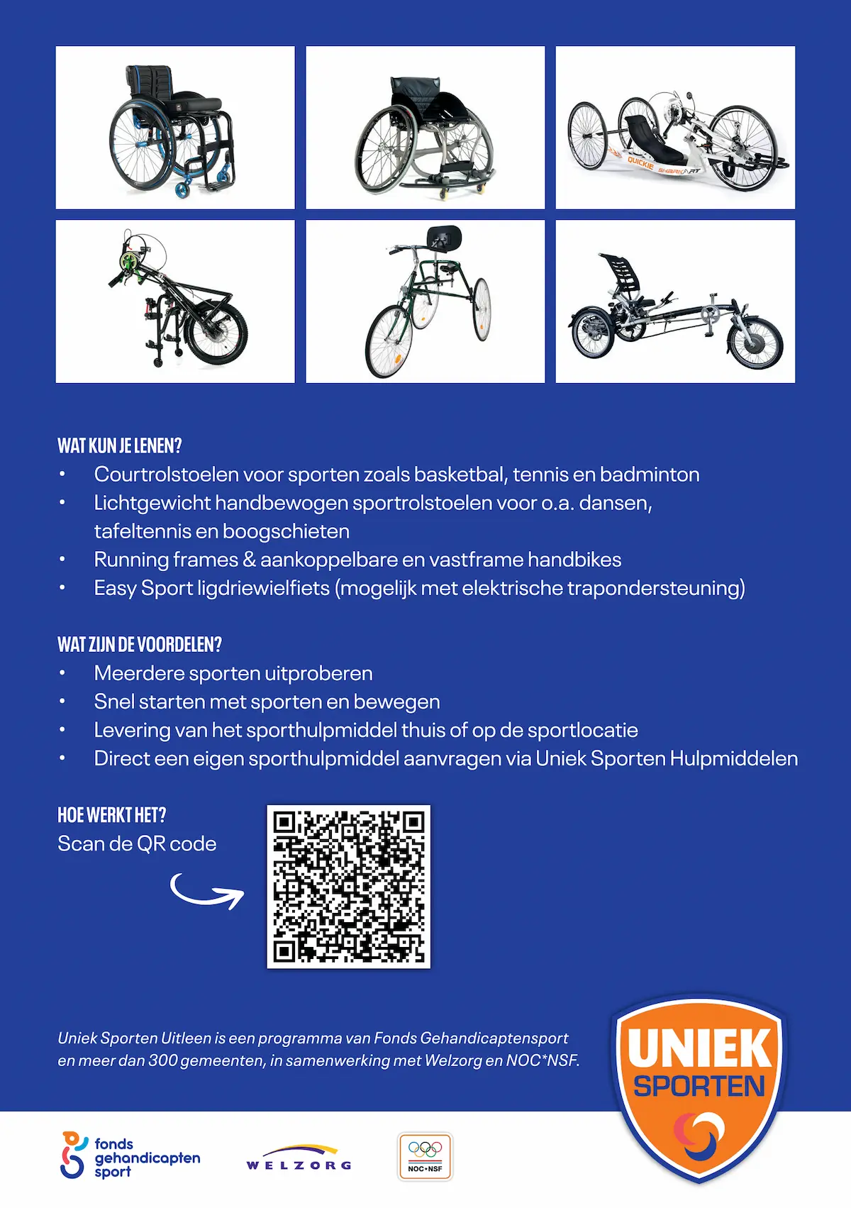 Uniek Sporten Uitleen zorgt ervoor dat mensen met een fysieke beperking sporthulpmiddelen kunnen uitproberen, zoals sportrolstoelen of handbikes. Door de beschikbaarheid van sportvoorzieningen vanuit een uitleenpool, kun je uit het brede aanbod uiteindelijk de sport kiezen die het beste bij je past.